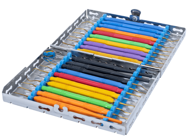 • Innovative color coding and modular silicone holders: The innovative shape reduces instrument contact allowing for more liquid flow and for more efficient cleaning. 5 color coding tabs for practice organization included with every cassette. Silicone rails can be assembled in any position, are compatible with all handle diameters.