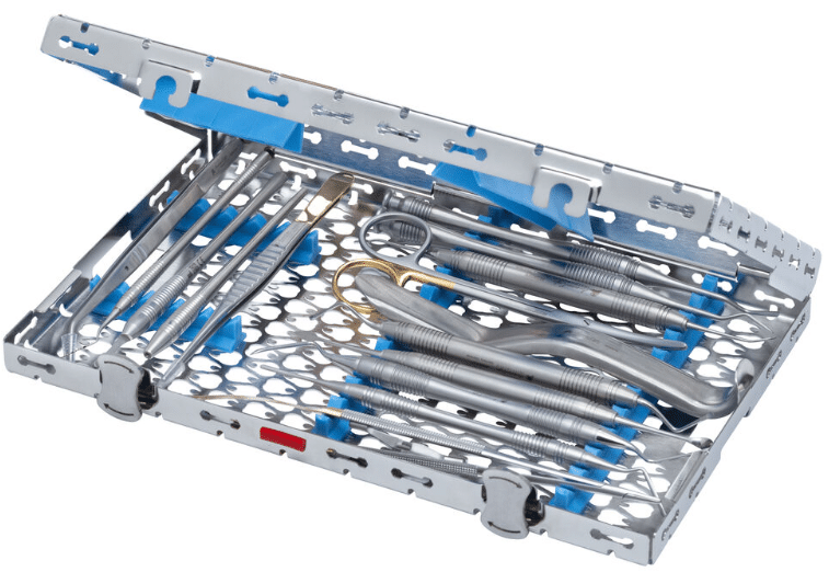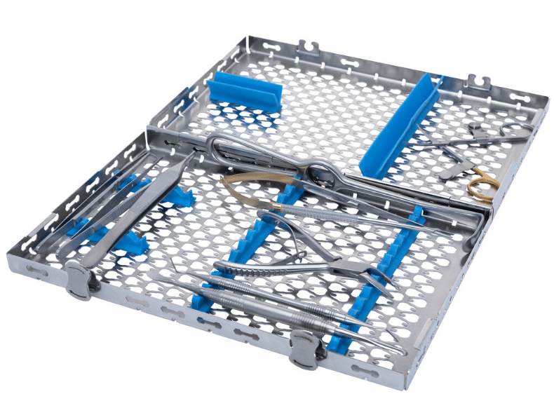• Closed Design: Reduces the risk of sharps injuries by keeping instruments secure and organized throughout cleaning, sterilization, and storage, while limiting hand contact with contaminated sharps.