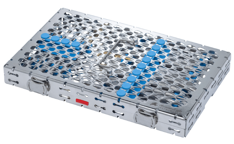 • New design for a better cleaning process: The new and innovative laser cutting pattern guarantees maximum efficiency during the cleaning and sterilization process while ensuring stability and strength of the cassette. Specially designed for washer disinfector use, enabling maximum water flow. Smooth round corners and slotted edges increase drainage and reduce drying time.
